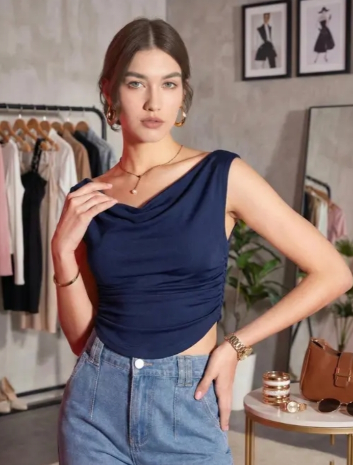 Istyle Can Navy Blue Women's Draped Cowl Neck Crop Top | Stretchable Lycra Sleeveless Party Wear Slim Fit Western Top for Girls & Women
